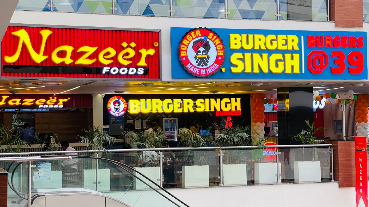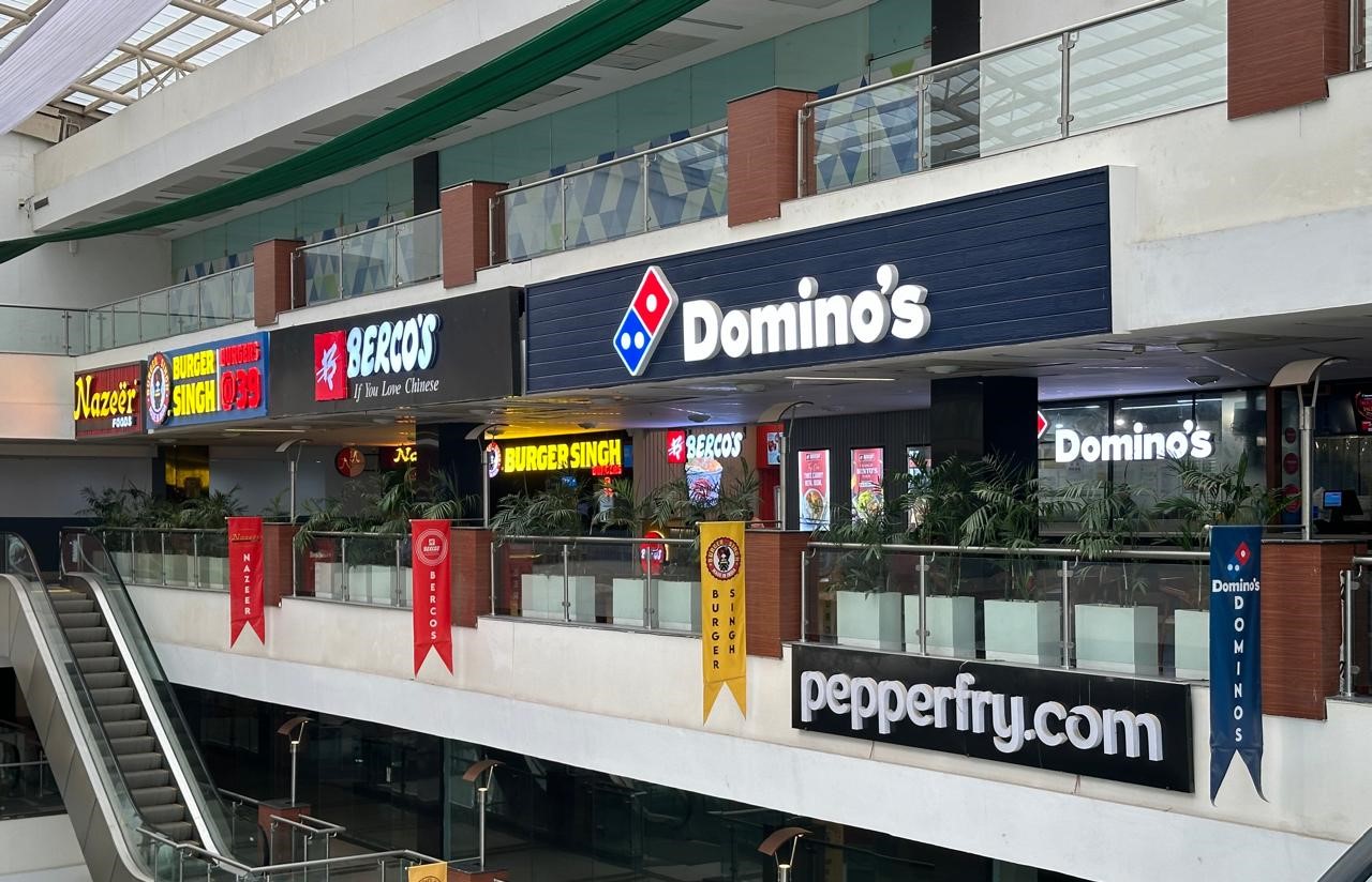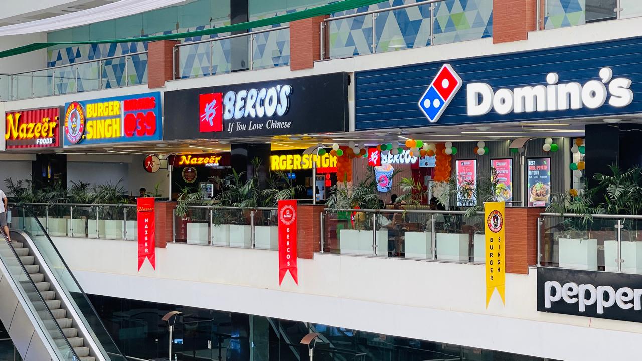 an indoor plaza within a facility that is contiguous with the counters of multiple food vendors like- Dominos, Burger Singh, Nazeer, Berco's.